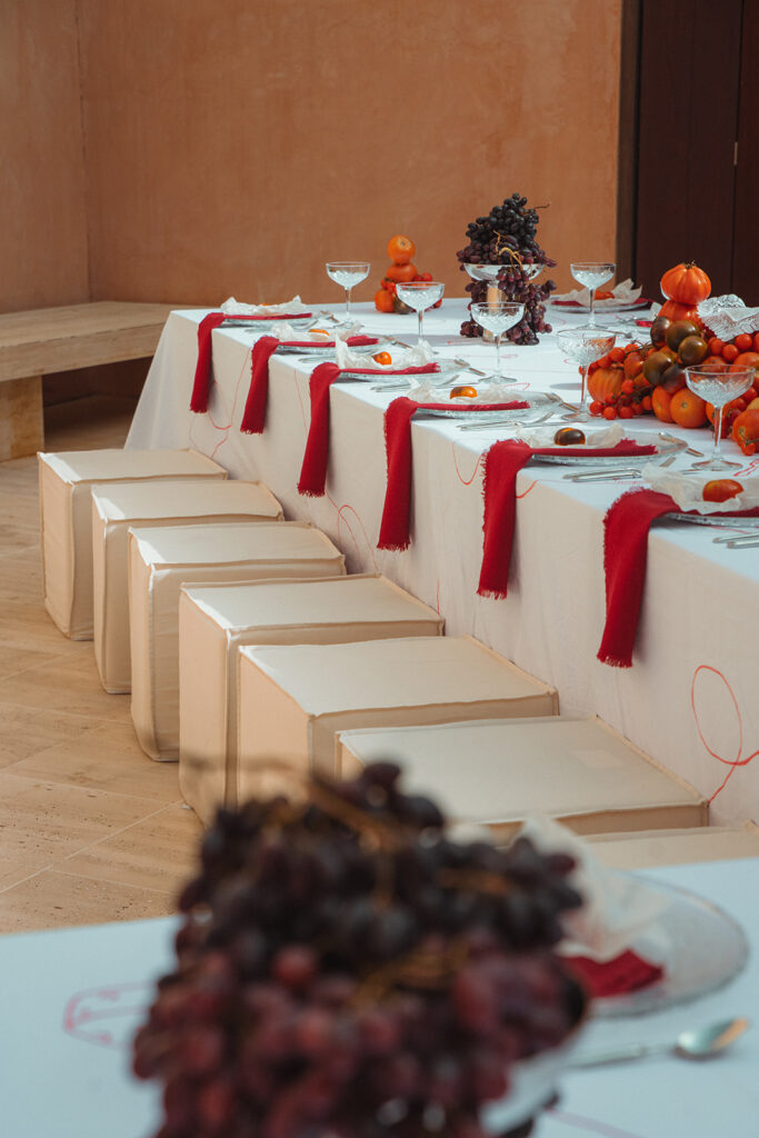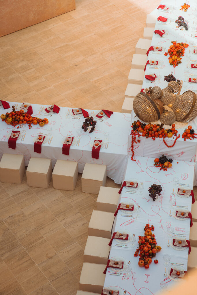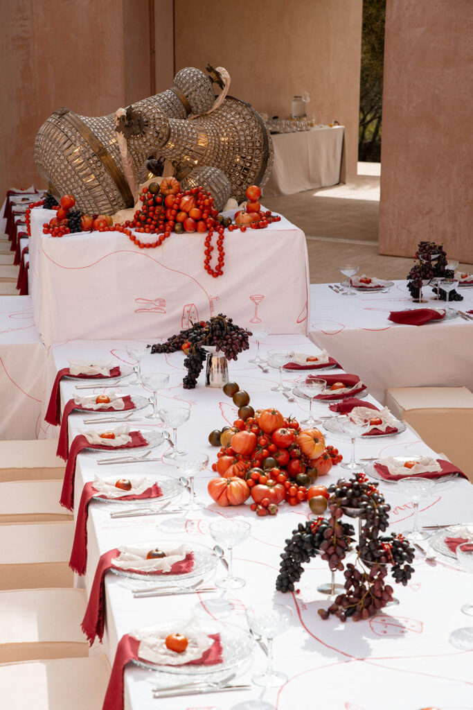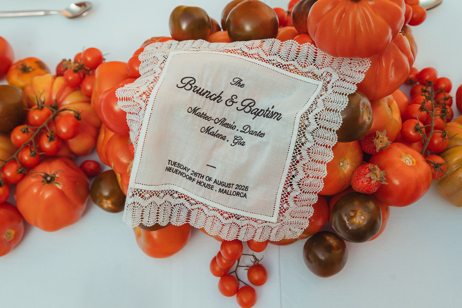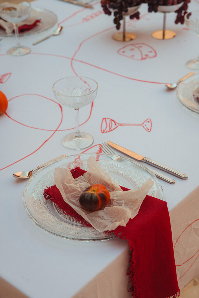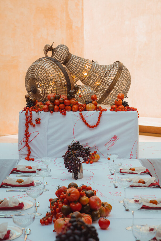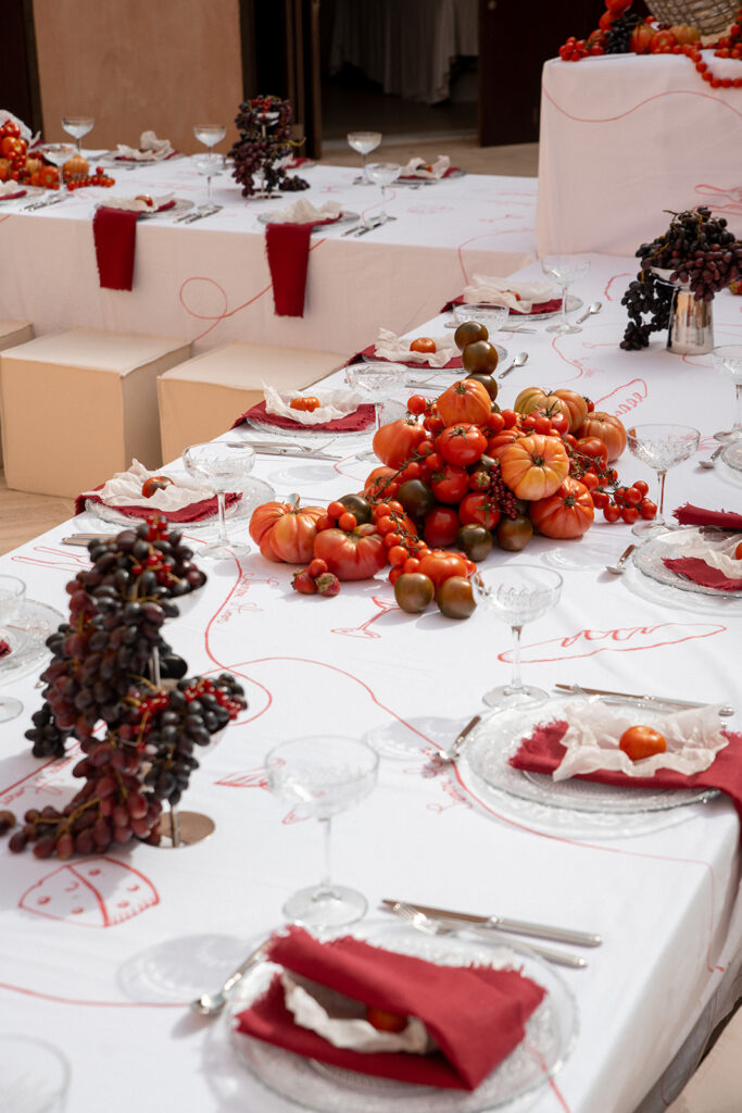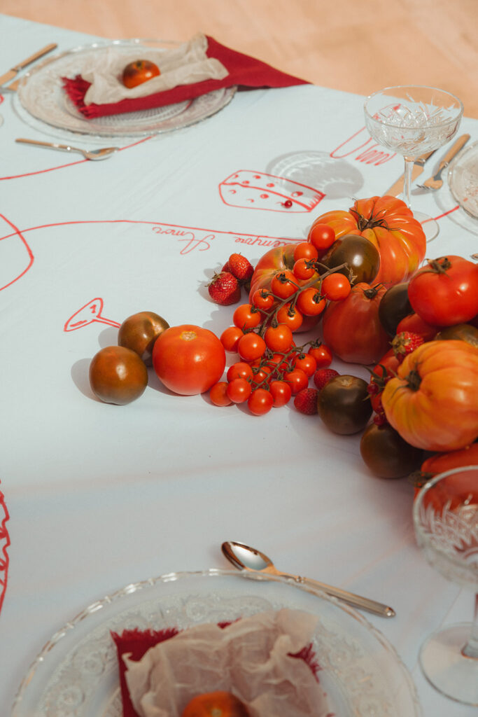 De setting van de avond voordien had plaatsgemaakt voor een nieuwe prachtige setting met een overvloed aan tomaten en fruit met vrolijke tekeningen over de tafelkleden en leuke accenten.