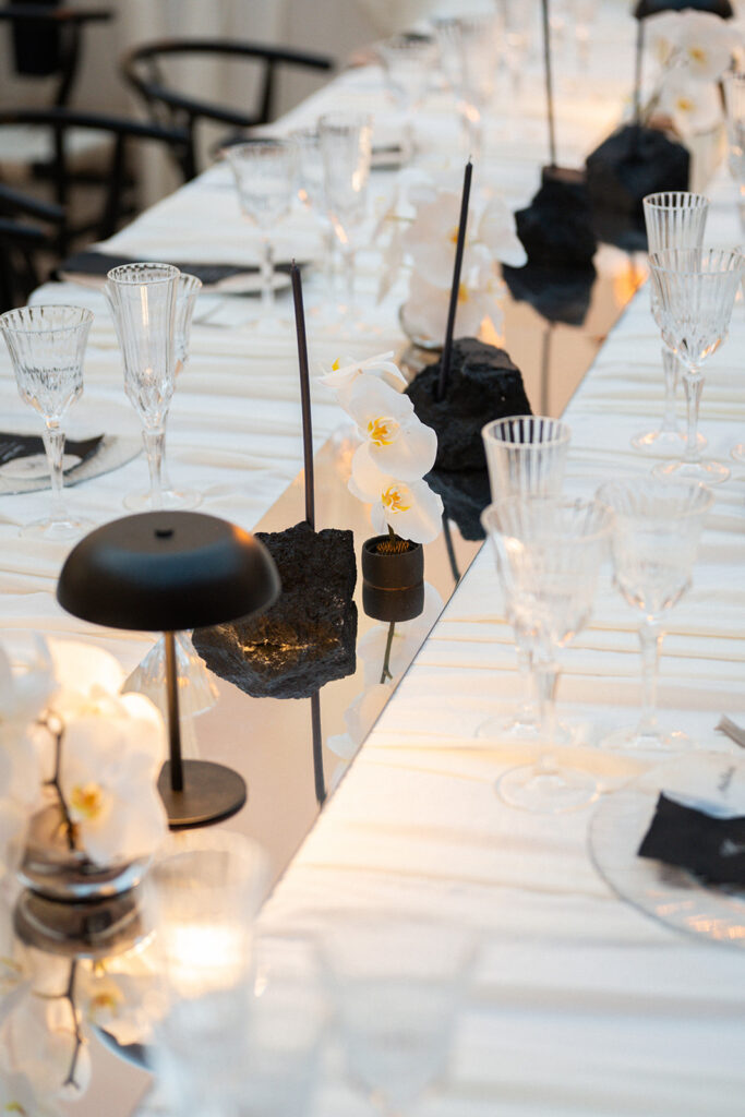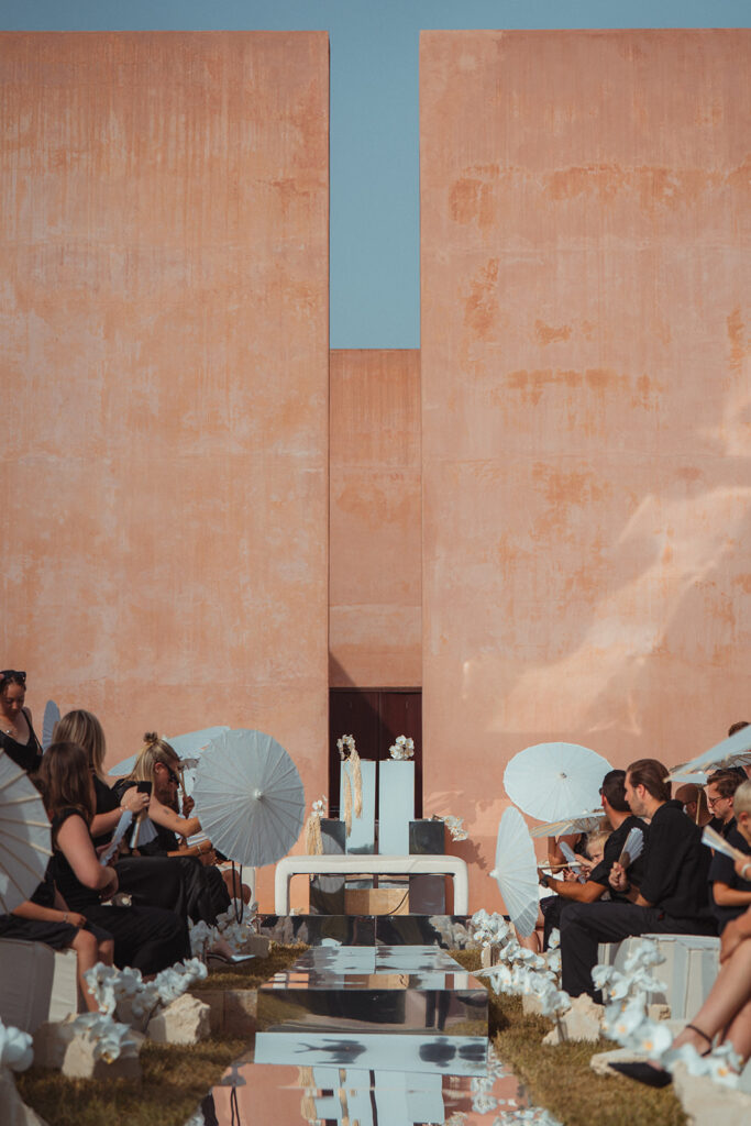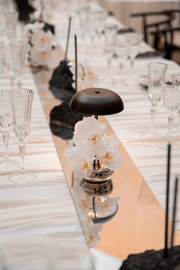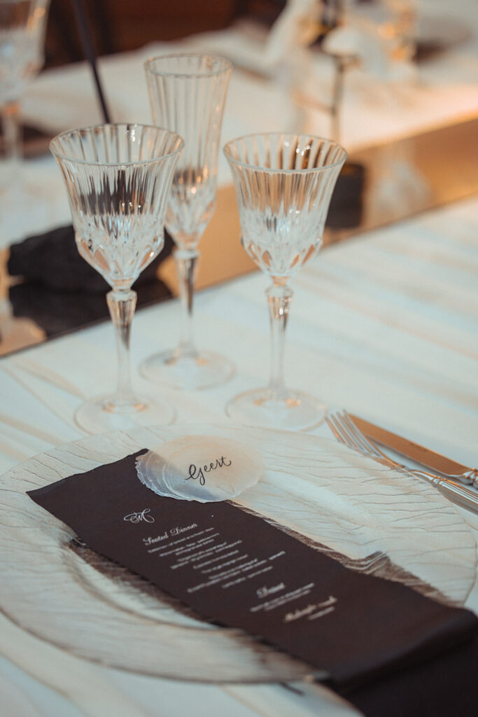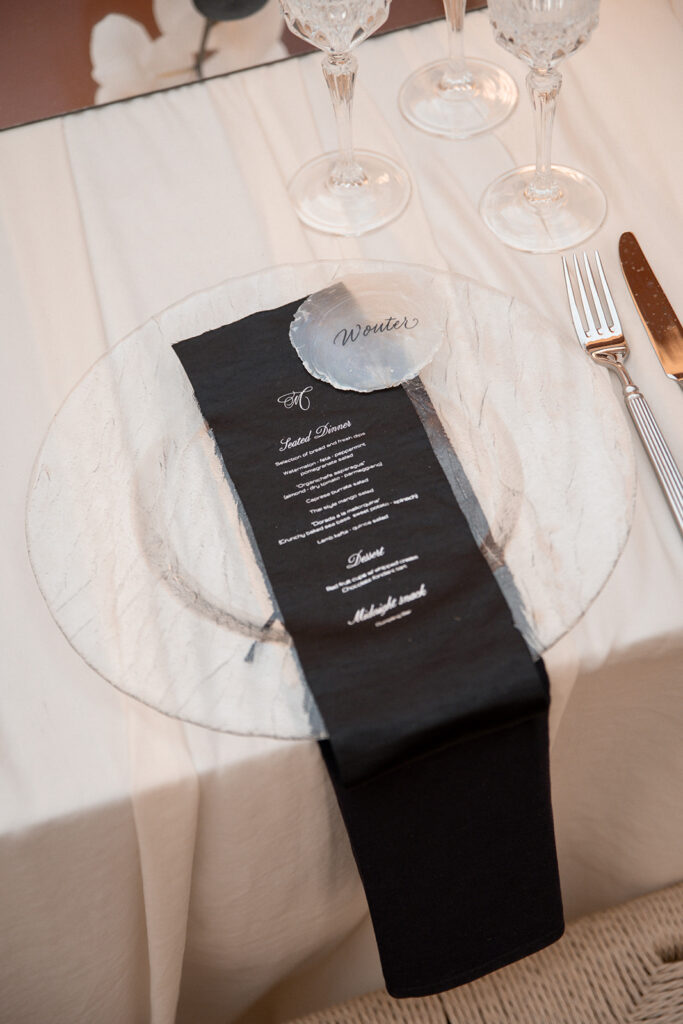 Van uitnodiging tot handgeschreven schelpen, tot spiegel catwalk voor de ceremonie. Elk element in elkaar verweven in een duidelijk thema. Stijlvol, edgy, anders en toch zo hen.