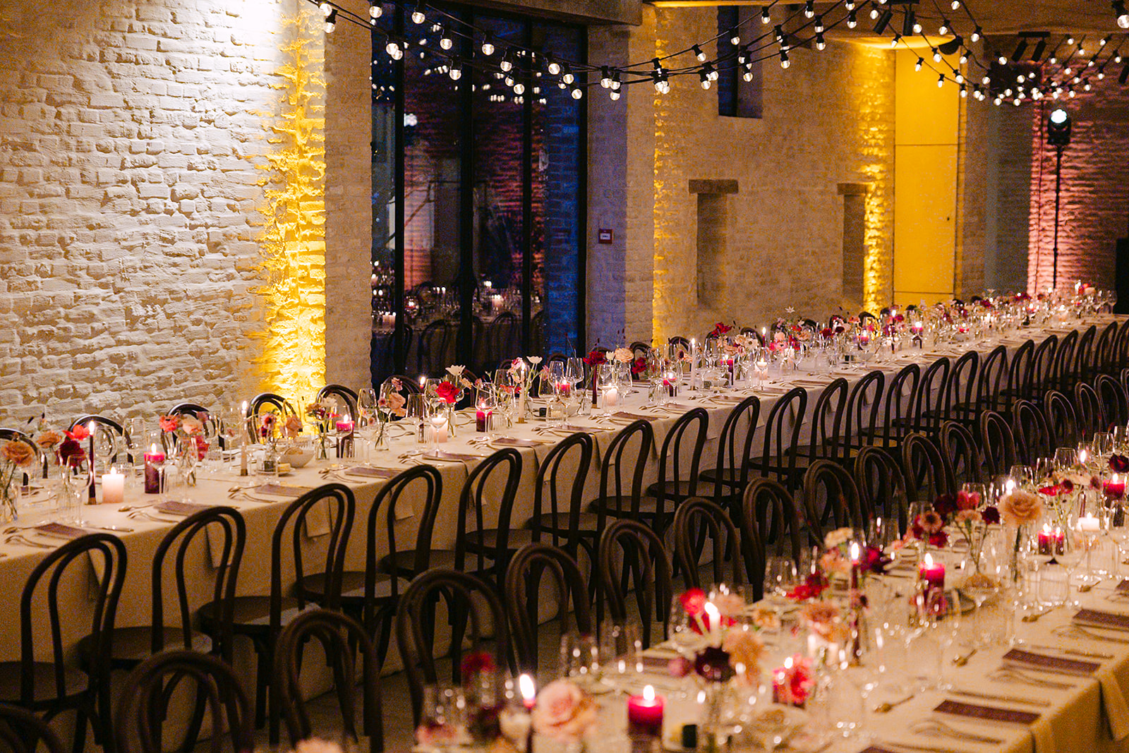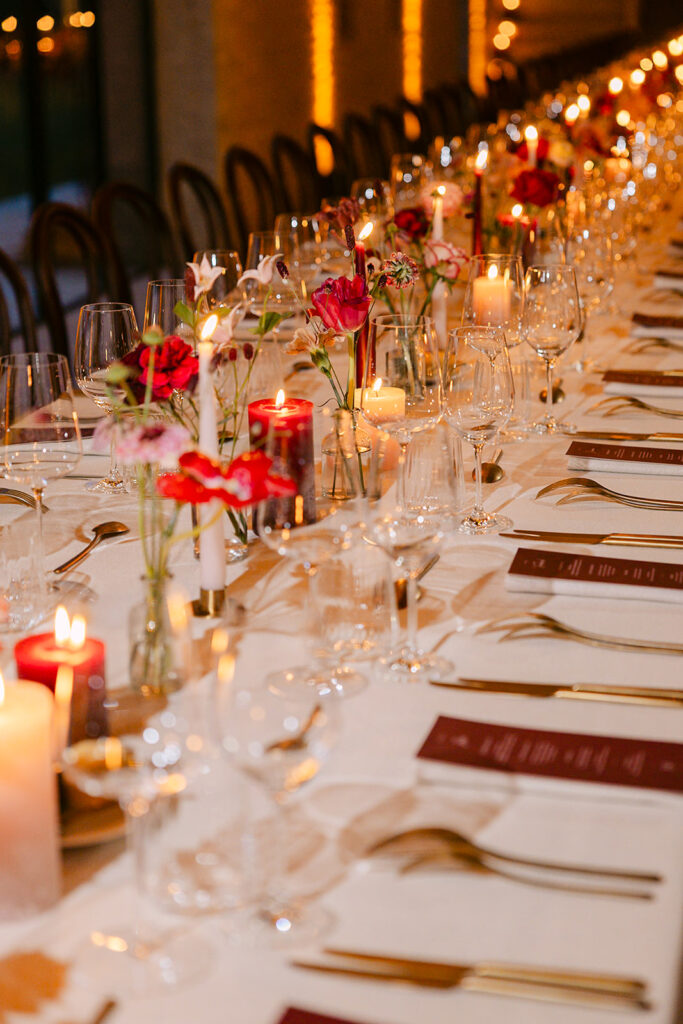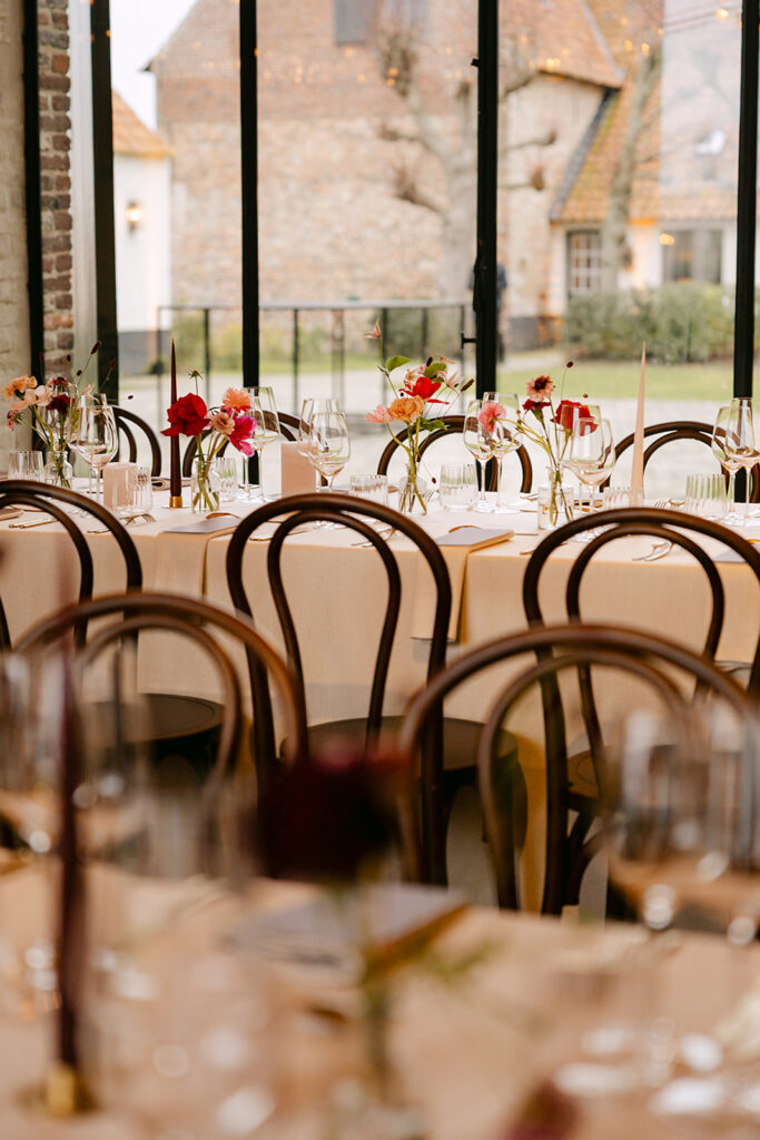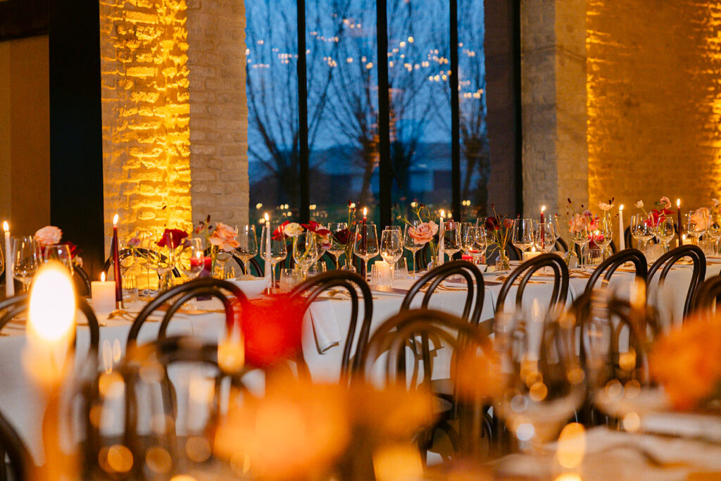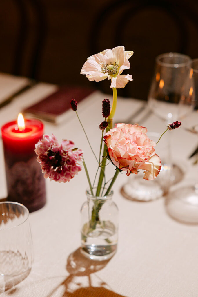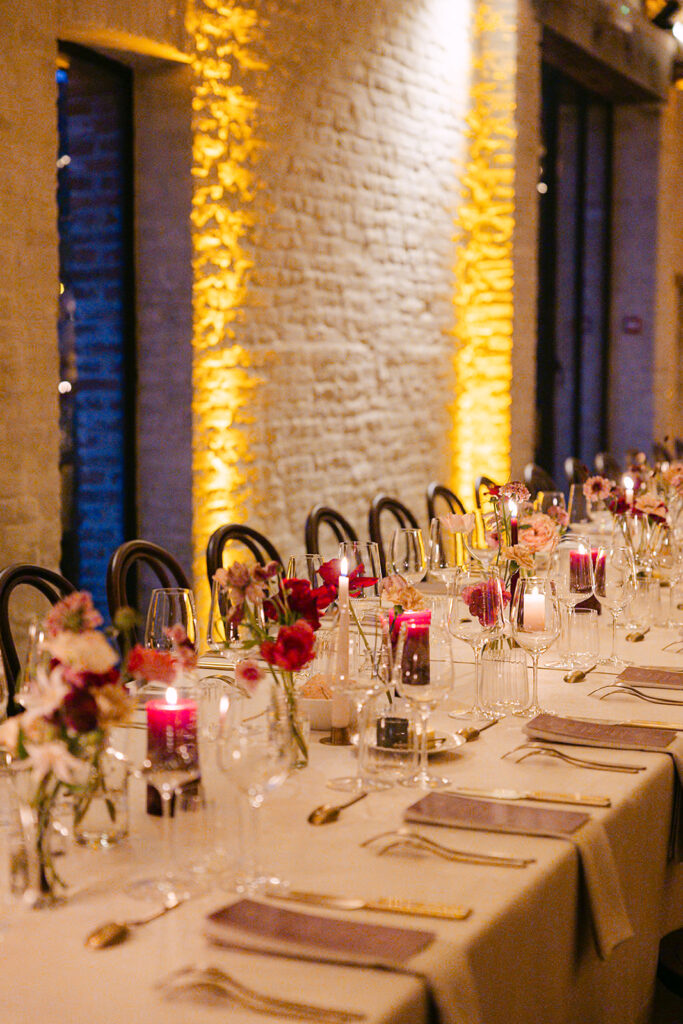 Voor de styling kozen ze voor een kleurenpalet van burgundy en roze, helemaal passend bij de sfeer van het seizoen. De locatie werd gebruikt voor zowel de ceremonie als de receptie en het diner. In de dinerruimte kozen we voor twee lange tafels, aangekleed met bloemenvaasjes en kaarsen in het gekozen kleurenthema.