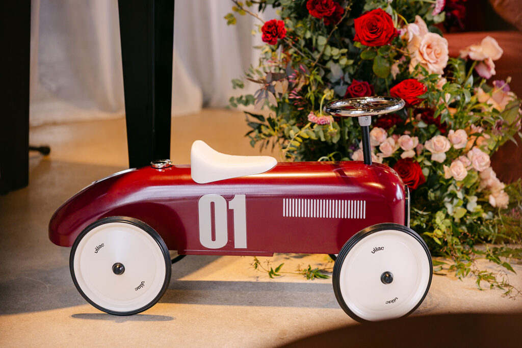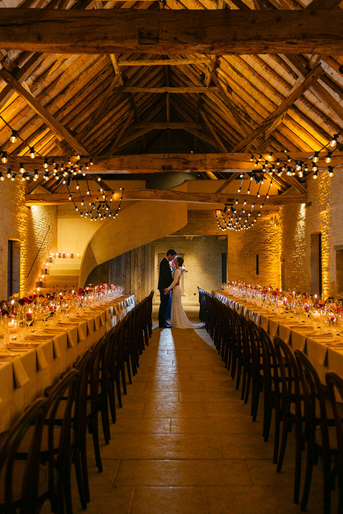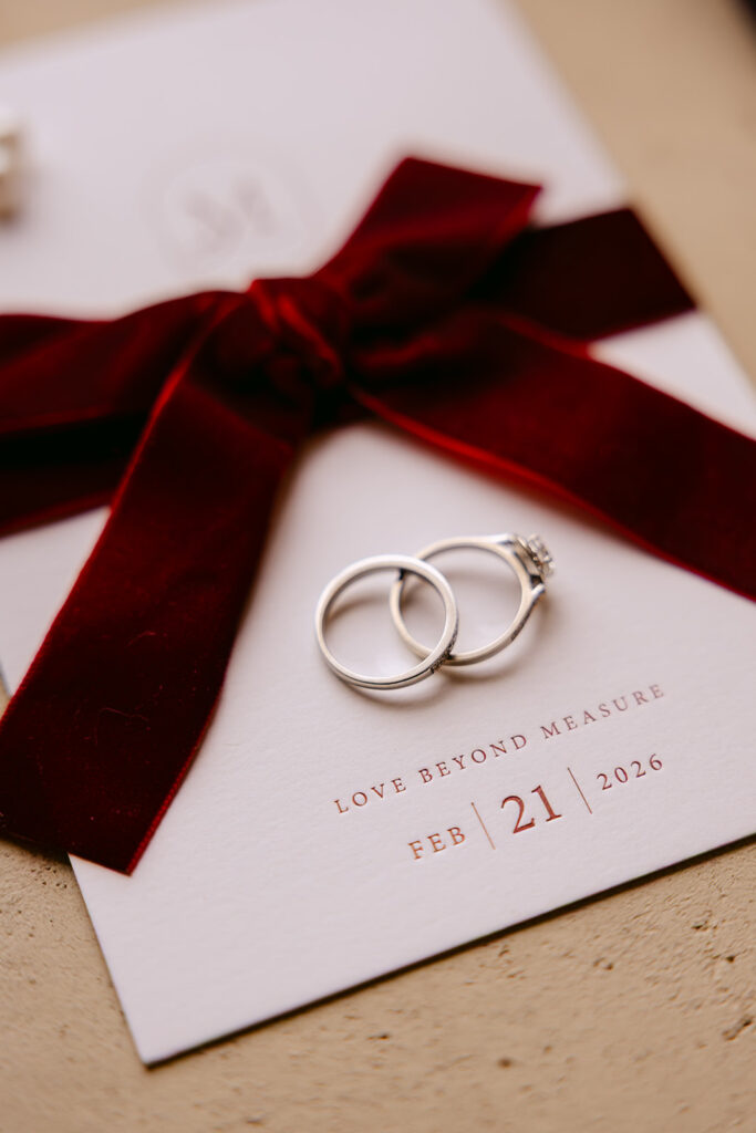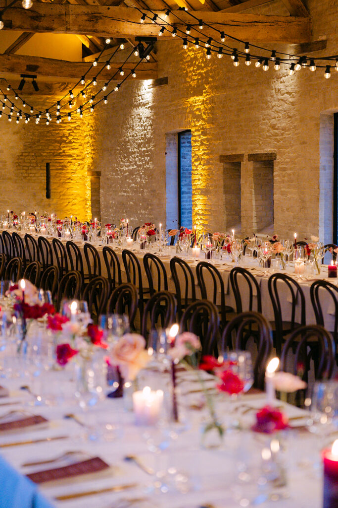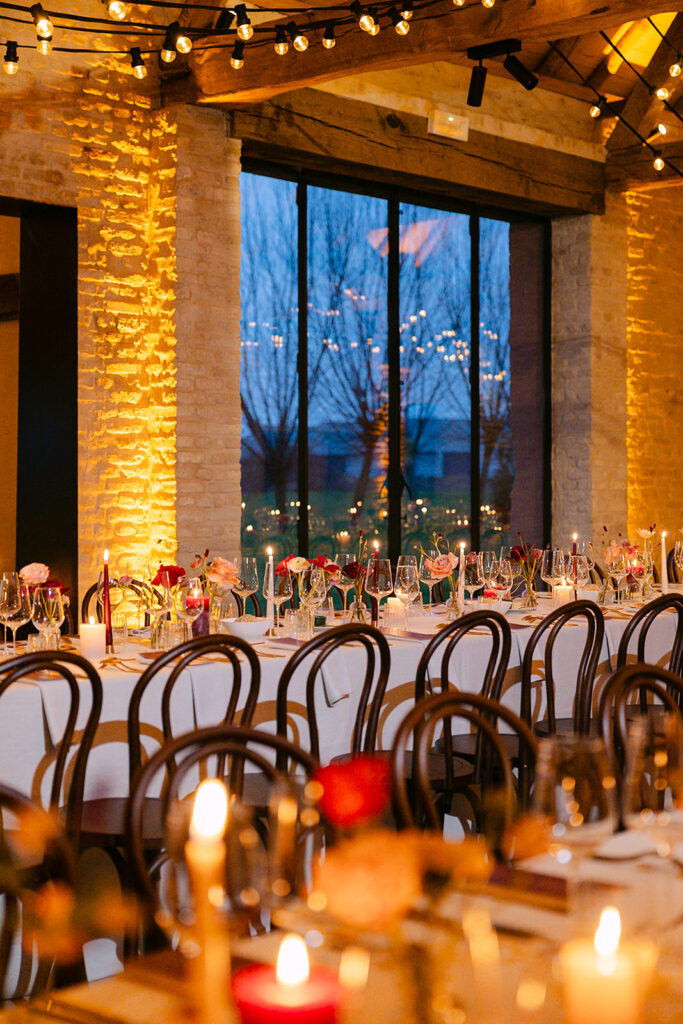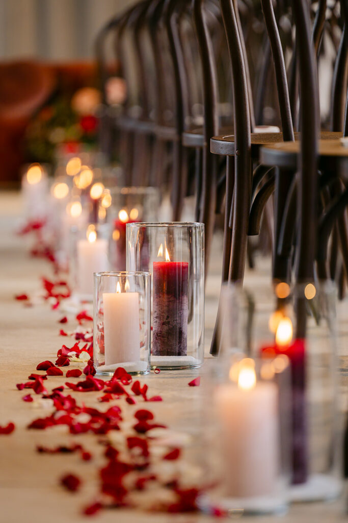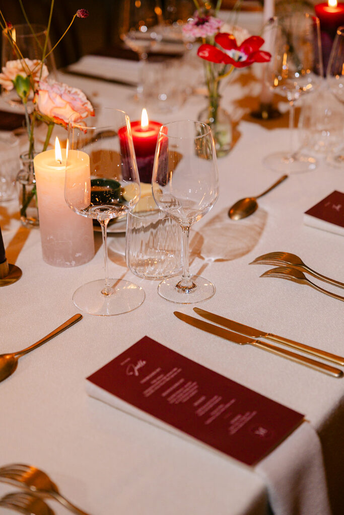 Voor de styling kozen ze voor een kleurenpalet van burgundy en roze, helemaal passend bij de sfeer van het seizoen. De locatie werd gebruikt voor zowel de ceremonie als de receptie en het diner. In de dinerruimte kozen we voor twee lange tafels, aangekleed met bloemenvaasjes en kaarsen in het gekozen kleurenthema.