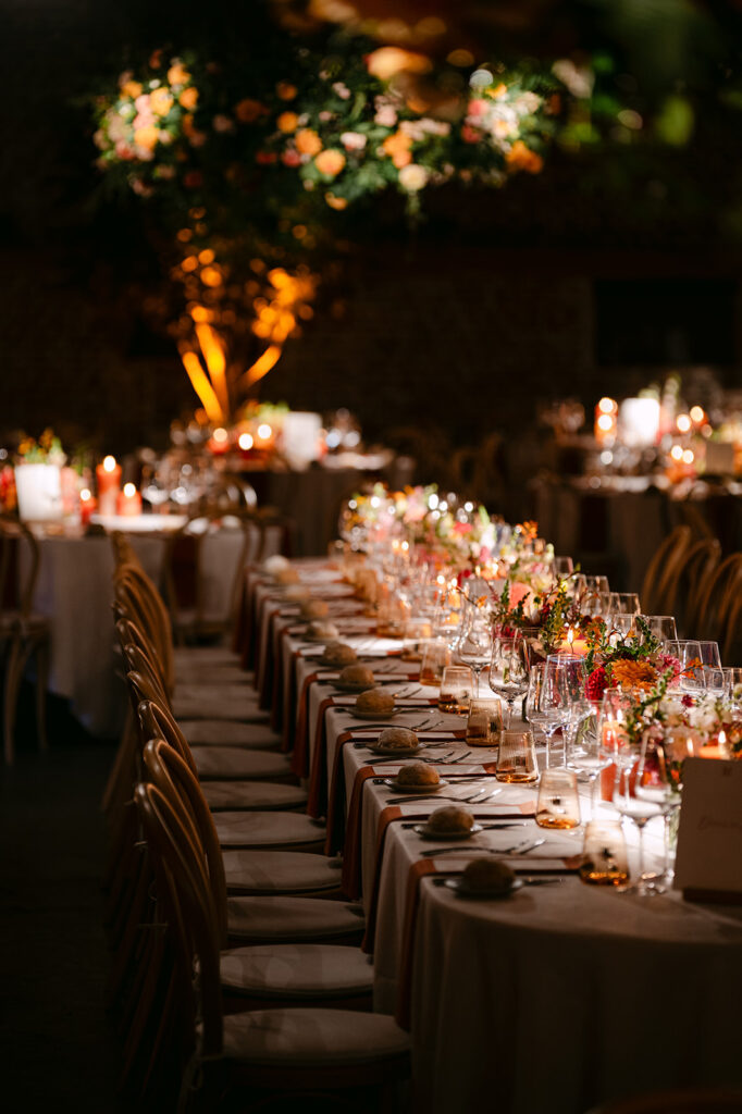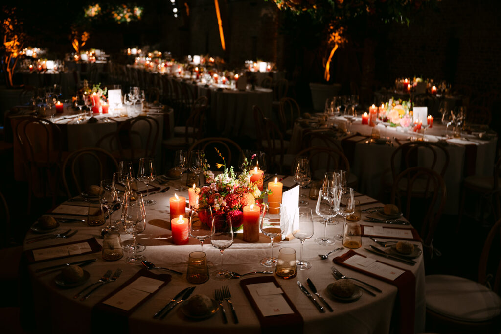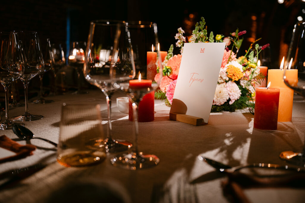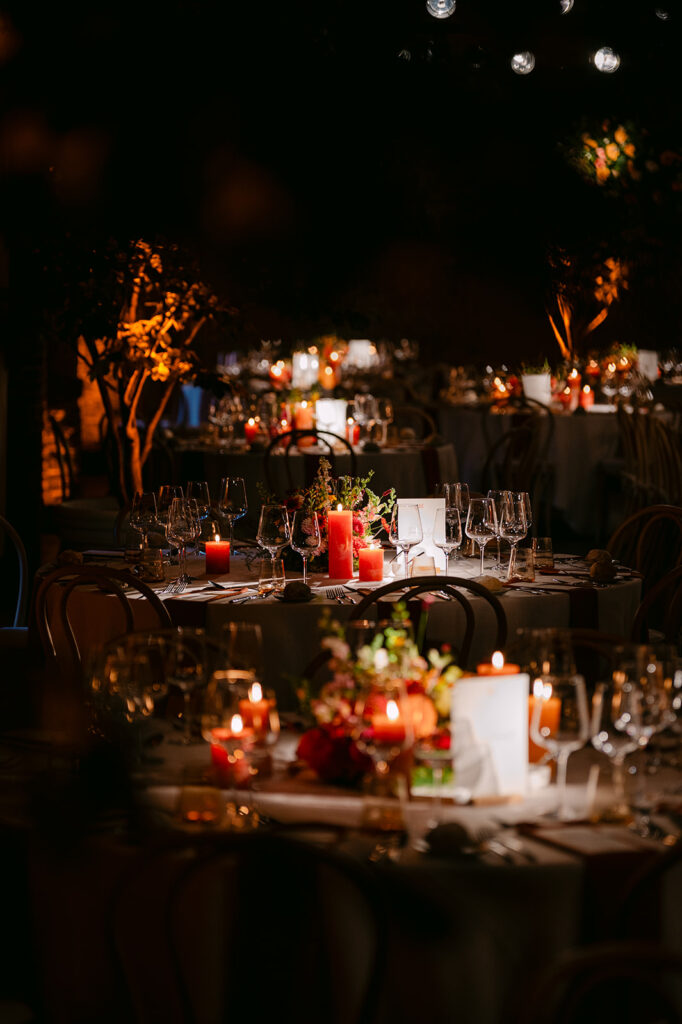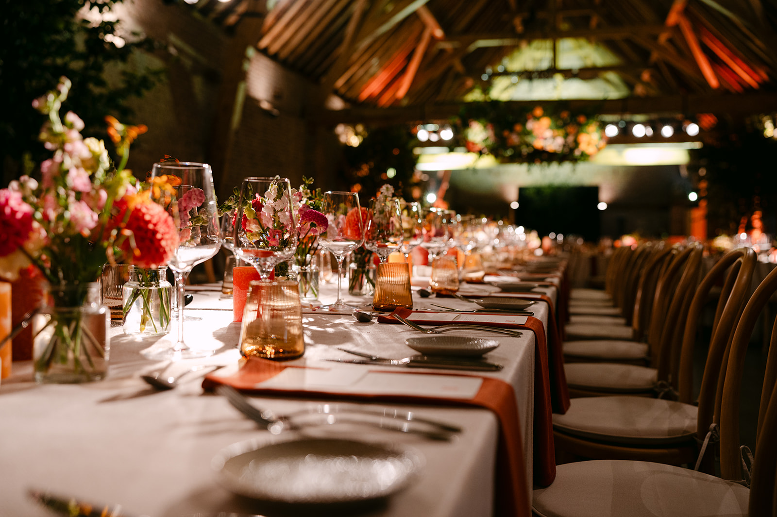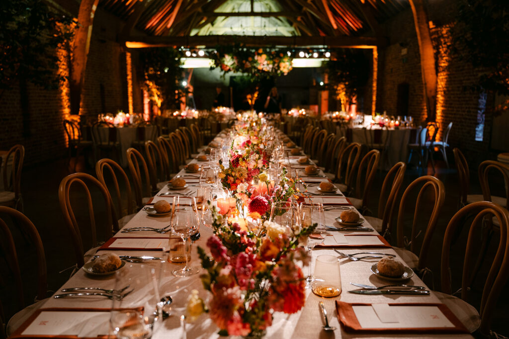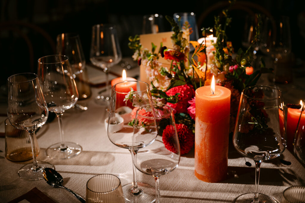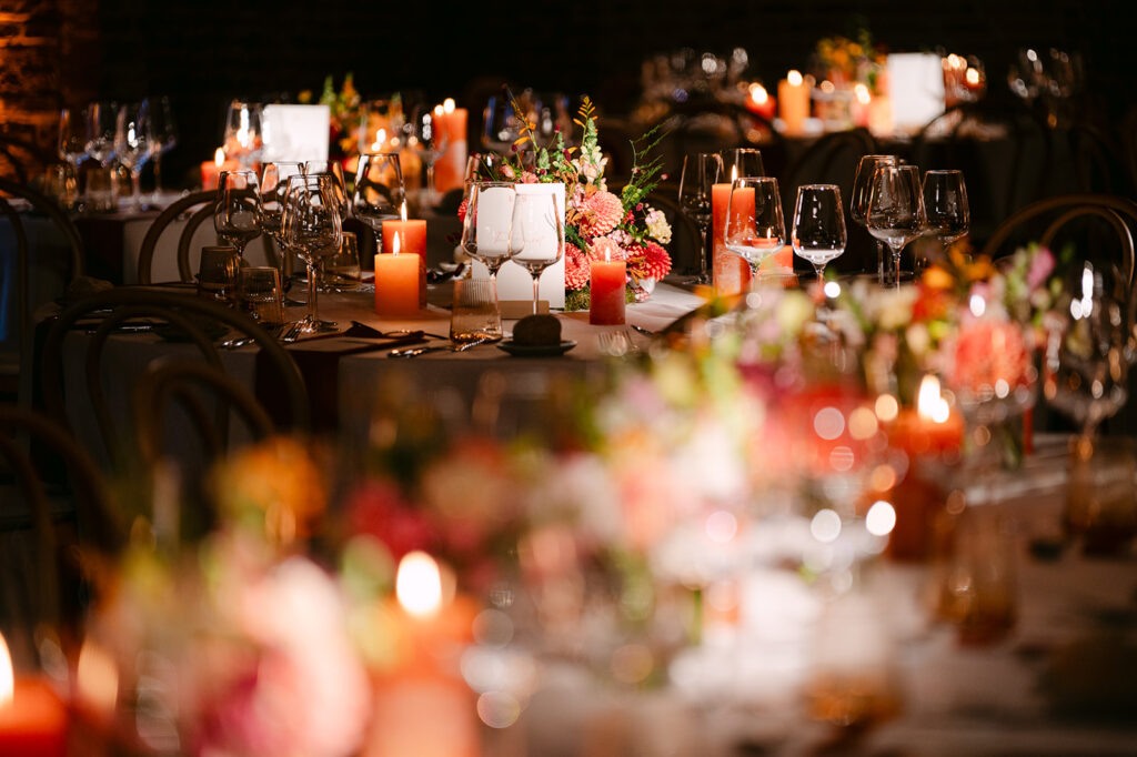 Met oranje en andere diepe herfstkleuren creëerden we een zachte gloed die de hele zaal omhulde. Een setting waar gezelligheid en elegantie elkaar moeiteloos vonden.