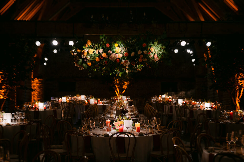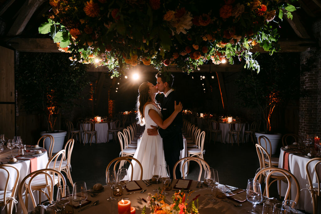 De zaal werd omgetoverd tot een echte najaarsdroom. Enkele herfstbomen trokken meteen de aandacht en brachten de natuur in de ruimte. Boven de gasten zweefden twee indrukwekkende lusters van bloemen, gevuld met warme tinten.